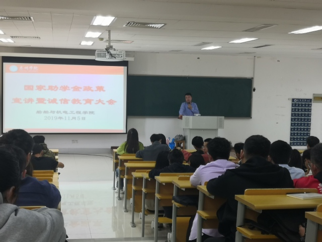 11月5日中午,院学工办于晶晶老师主持召开国家助学金政策暨诚信教育大会,辅导员刘亚文老师及船机公司全体贫困生出席会议。本次大会主要向同学们介绍了国家助学金的相关政策,教育员工要根据自己的家庭经济情况申请,一旦发现失信,取消本年度所有的评奖评优资格。