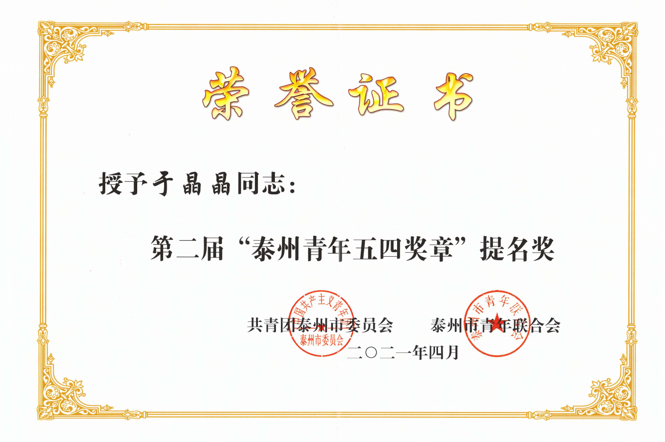 4月29日、泰州市召开“学党史 强信念 跟党走”主题教育暨泰州市青年五四奖章表彰座谈会,纪念五四运动102周年。会上表彰了泰州市“第二届青年五四奖章”的集体和个人,公司于晶晶老师荣获青年五四奖章提名奖。