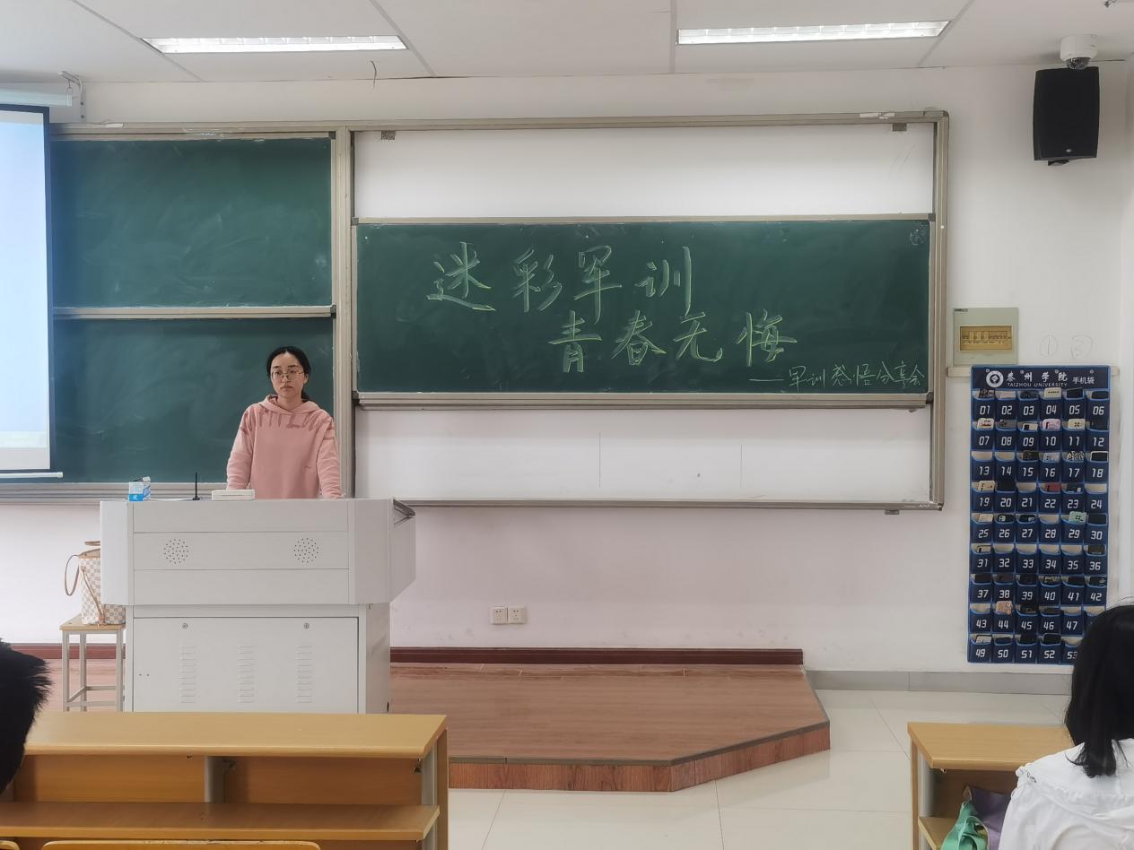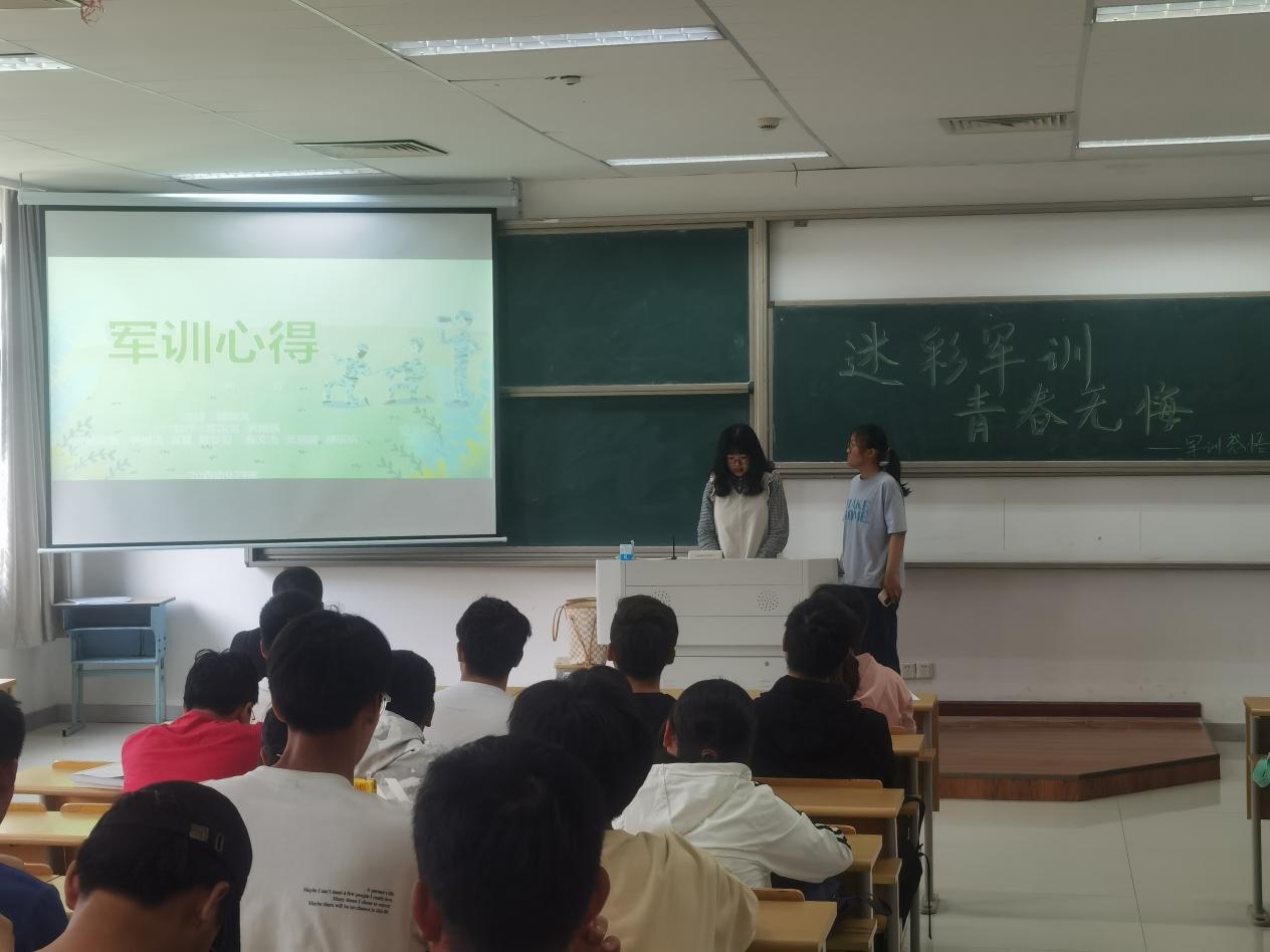 同学们通过一张张照片回顾军训生活,每组都派出代表分享自己小组在军训中的感悟,不同的分享角度,让我们感受到不同的军训。辅导员刘老师给同学们分析了大家在军训前后发生的变化,并希望同学们可以继续保持在军训中养成的良好习惯。