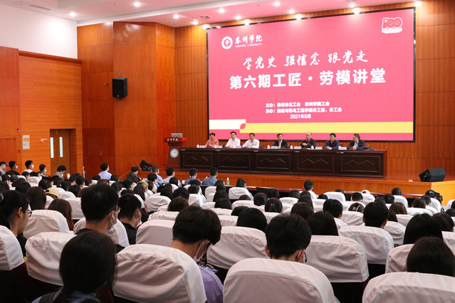为扎实推进党史学习教育,大力加强新时代劳动教育,全面实施阳光学工“思政引领工程”,5月26日,由泰州市总工会和威廉希尔工会主办,船舶与威廉希尔体育承办的“学党史、强信念、跟党走”第六期工匠·劳模讲堂在D1216报告厅举办。党委常委、副董事长周建超、泰州市总工会原副主席吴江泽、泰州市劳模办副主任刘月凤、泰州市教育局工会负责人李文林,教务处处长潘小明、船舶与公司党总支书记陈克宏与全校各公司师生代表200余人出席宣讲活动。活动由校工会主席刘素红主持。