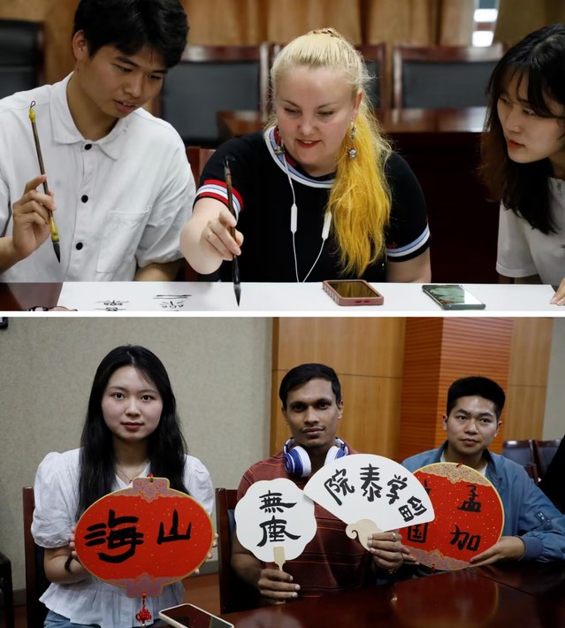 书法专业的员工向外教和职工们介绍了笔墨纸砚、握笔姿势、书写笔法和技巧,在他们的耐心指导下,外籍师生执笔、蘸墨,对照着书法作品进行临摹,并展示学习成果。大家纷纷表示,自己特别喜欢中国的书法和文化氛围,通过书法感受到了中国文化的博大精深。