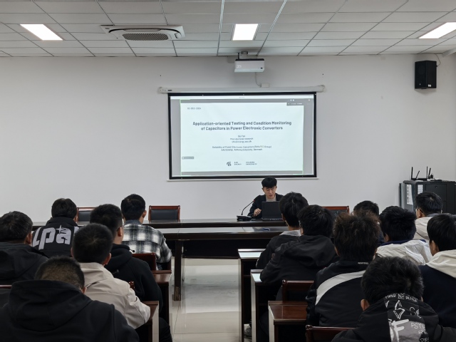 此次讲座由毛怡老师主持,丹麦奥尔堡大学姚博博士主讲。姚博博士首先为老师和同学们介绍了丹麦王国以及奥尔堡大学能源系的基本情况。并介绍了他所在科研团队(ReliaPEC Group)的科研方向以及科研成果。在此基础上,姚博博士围绕他博士阶段的研究方向为老师和同学们展开了详细的介绍。首先,他介绍了电力电子电容器失效存在的风险,强调了加强其可靠性研究的重要意义。基于此研究背景,他为大家详细讲解了电力电子电容器可靠性的理论以及实验方法,并介绍了电容老化测试的方法以及其失效机理。最后,他又进一步为大家介绍了对应的电容状态检测的指标。基于这一系列的研究,最终实现了电容运行时可靠性的全面提升。