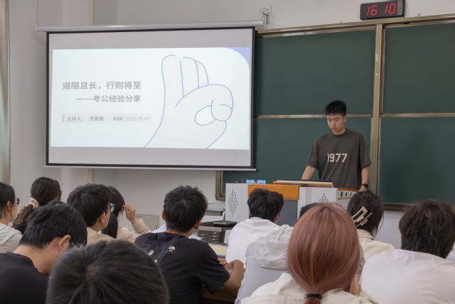 活动伊始,王志恒以“考公动机坐标系”模型开启分享。他提出“三维定位法”,即从价值维度明确公务员职业的社会价值与个人成长契合点;从区域维度科学评估“家乡情怀”与“发展平台”的博弈关系;从竞争维度运用历年岗位报录比、分数线大数据精准选岗,指出合理选岗是考公成功的关键。在谈到笔试环节时,他深入拆解备考策略,建议将备考过程划分为基础、强化、冲刺三个阶段。以行测中数量关系模块为例,他强调要熟练掌握常见公式与解题方法;针对申论文章写作,则指出应着重关注文章结构与表达技巧。在面试分享环节,王志恒提醒同学们提前规划、早做准备。他建议从知识储备、时政热点积累和日常练习三个方面入手,全面提升面试能力。特别强调,面试时个人仪态、神情交流、情感表达等细节是面试高分的制胜法宝,答题过程中要结合实际案例,以此增强内容的说服力和感染力。