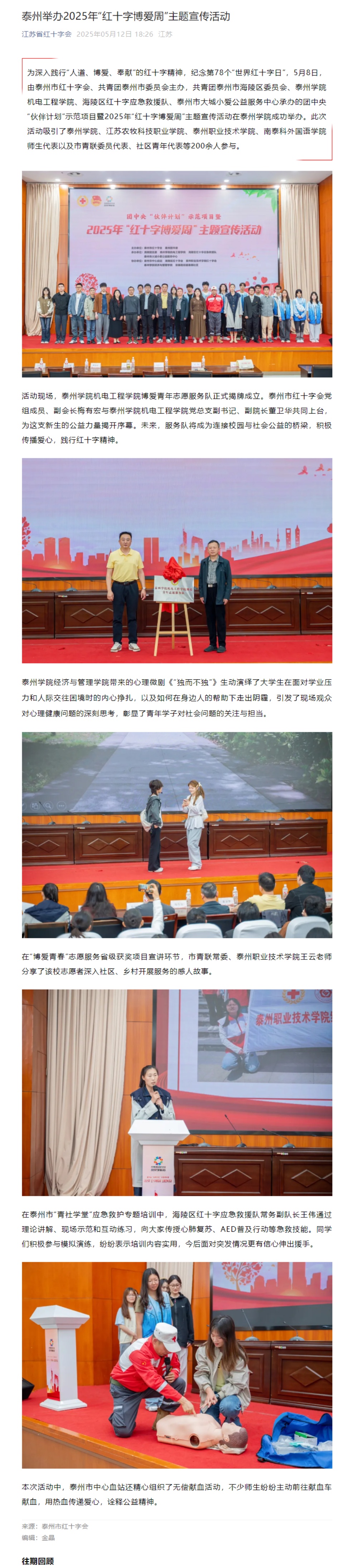 《江苏省红十字会》《泰州日报》近日报道在威廉希尔体育举行的团中央“伙伴计划”示范项目暨2025年“红十字博爱周”主题宣传活动