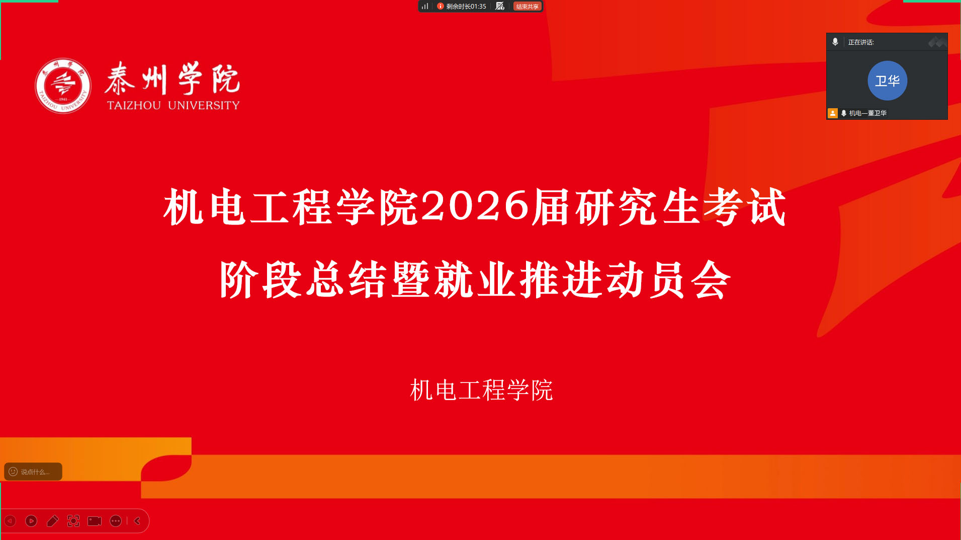 为动态把握2026届毕业生考研情况,鼓励毕业生抓住秋招就业关键节点,12月22日上午公司开展2026届研究生考试阶段性总结暨就业推进线上动员会。公司党总支副书记、副经理董卫华,辅导员及2026届考研员工代表参加活动。